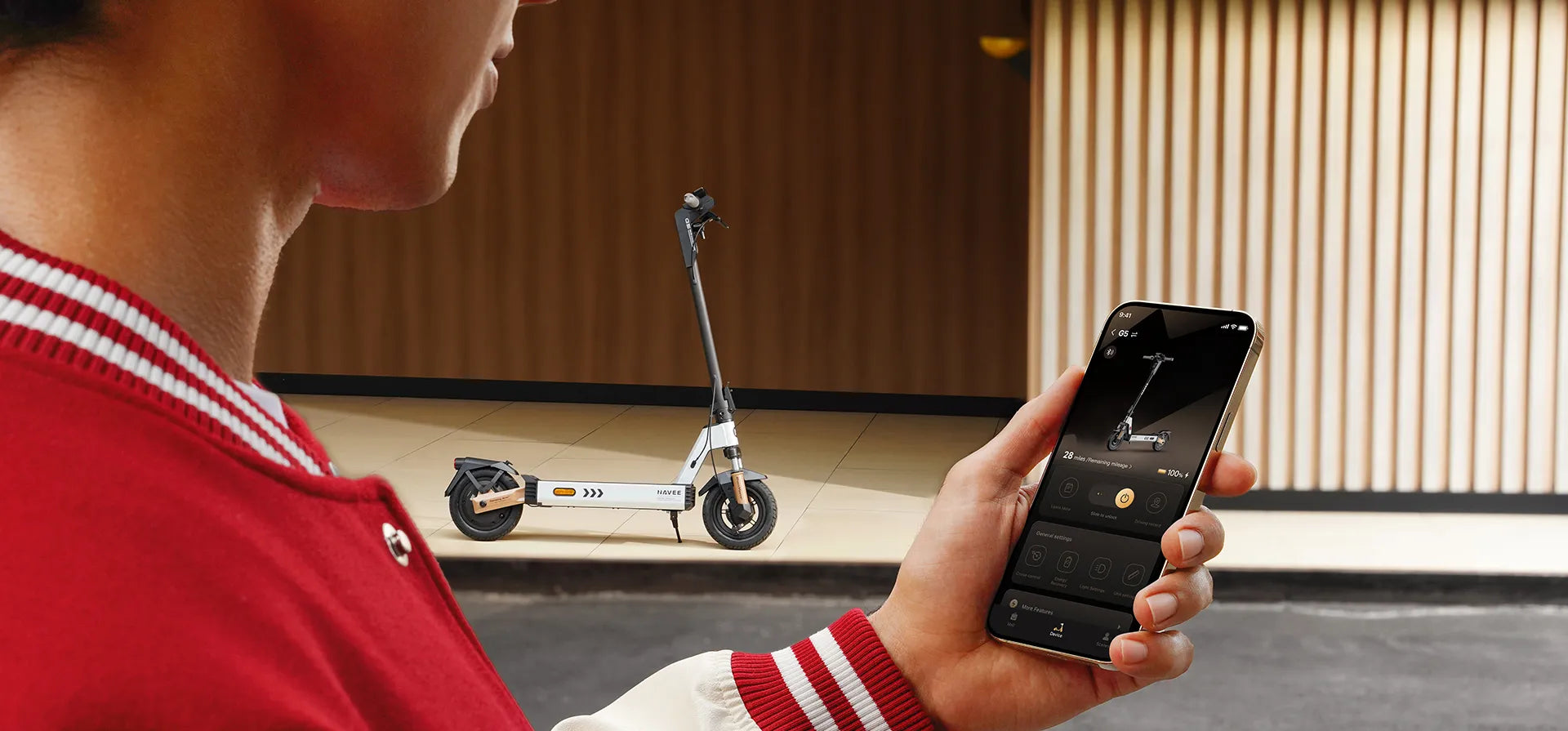 El Wheely H6 está equipado con una potente iluminación delantera y trasera, así como con luces intermitentes integradas para una mayor visibilidad en el tráfico. La clasificación IPX4 protege el scooter eléctrico contra salpicaduras de agua y polvo, lo que lo prepara para las condiciones nórdicas. La bocina eléctrica, el control de crucero y la tecnología NFC contribuyen aún más a una experiencia de conducción moderna y segura.